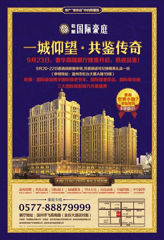 据了解,乾顺·国际豪庭此次展厅开放的邀请函将于9月20-22日,限量申领,并且凭邀请函可兑换精美礼品一份,申领地址:温州市松台大厦A幢19楼。