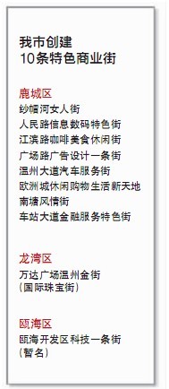 昨日,我市正式出台了《关于加快创建温州市特色商业街实施意见》,力争到“十二五”期末,全市创建国家级特色商业街1条,省级特色商业街2条以上,市级特色商业街10条以上。