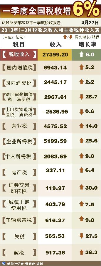 财政部27日发布2013年一季度税收报告显示,今年前三个月全国税收总收入完成27399.20亿元,比去年同期增长6%,增速回落了4.3个百分点,其中部分主体税种出现负增长,而房地产相关税收收入则出现反弹。