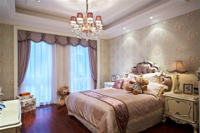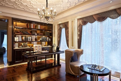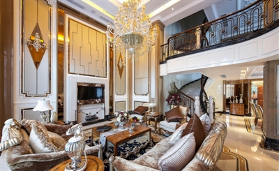 该项目样板房建筑面积372㎡,设计4房3厅5卫。进入该项目室内首先要经过花园区,花园式入户是御墅的一大特点,设计铁艺藤式门廊,进入花园后,看见修剪整齐的草皮,繁茂错落的灌木,乔木配合潺潺流水,让回家也如此惬意。进门玄关门廊入户,整套装修风格采用欧式设计,大理石拼花地面,实木护墙板,欧式吊顶等。