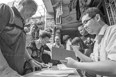房屋登记中心工作人员为公园路48号住户送上房产证。赵用摄