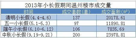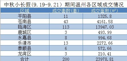 根据市住建委商品房网上销售管理系统数据统计中秋小长假(9.19-9.21)期间,温州全市(除瑞安外)共计成交商品房200套,成交面积23978.81平方米。