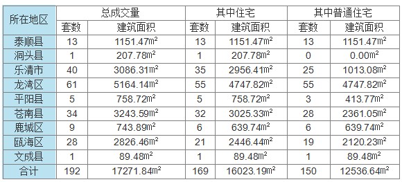 9月29日温州全市共计网签成交房产项目192套,成交建筑面积17271.84㎡。住宅为169套,成交面积为16023.19㎡。其中普通住宅成交150套,成交面积为12536.64㎡。