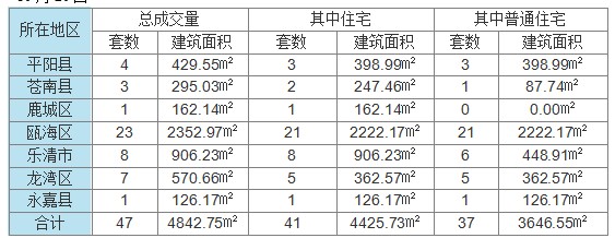 10月20日温州全市共计网签成交房产项目47套,成交建筑面积4842.75㎡。住宅为41套,成交面积为4425.73㎡。其中普通住宅成交37套,成交面积为3646.55㎡。
