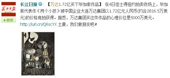 “万达是要将土豪进行到底么?”,“2个字,土豪;4个字,钱多人傻。”,“土豪,我们做朋友吧!”。万达集团1.72亿在纽约买下毕加索名画的举动,一时间引发了微博网友的热议,“土豪”也成为了万达在网络上的又一代名词。