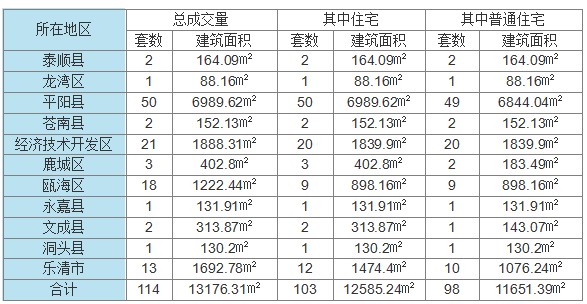11月6日温州全市共计网签成交房产项目114套,成交建筑面积13176.31㎡。住宅为103套,成交面积为12585.24㎡。其中普通住宅成交98套,成交面积为11651.39㎡。