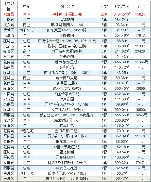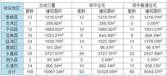 11月11日温州全市共计网签成交房产项目108套,成交建筑面积10967.34㎡。住宅为92套,成交面积为10325.08㎡。其中普通住宅成交80套,成交面积为8084.37㎡。