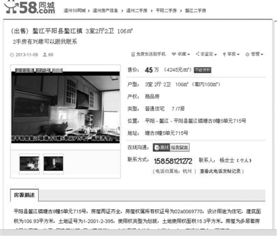 平阳的吴女士平时常常关注58同城网二手房信息,11月8日,网站上显示,一套位于平阳县鳌江镇的3室2厅2卫106㎡的房产标明售价为45万元,远远低于市场价,她不禁心动。