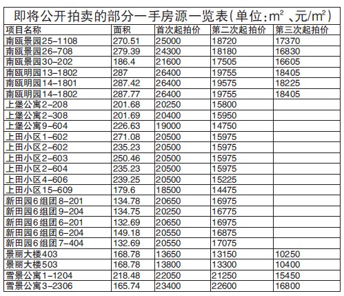 值得一提的是,将于12月13日举行的拍卖会上,南瓯景园、南瓯明园、景丽大楼、雪景公寓四个小区的部分房源都属于第三次拍卖,此次拍卖的起拍价比之前的两次更低(详见右表)。如南瓯景园一套287平方米的房源,在2012年12月13日首次拍卖时的起拍价为每平方米26400元,今年9月4日第二次拍卖的起拍价为每平方米19575元,此次的起拍价则为每平方米18225元,该小区目前的市场报价为23000元左右。另外,如雪景公寓一套218平方米的房子在去年12月7日首次拍卖时的起拍价为每平方米22050元,今年10月16日第二次拍卖时起拍价为每平方米21250元,这次起拍价仅为每平方米15450元。同时,将于12月11日举行的拍卖会上,共有29套房源参与拍卖。其中,新田园6组团的5套房源,面积都在130平方米以上,原本定于今年7月24日拍卖,后因报名人数不够,拍卖会延迟到8月14日举行,最后还是流拍。这次拍卖起拍价每平方米下降了3000多元。