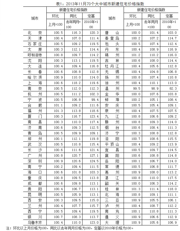 (一)与上月相比,70个大中城市中,价格下降的城市有1个,持平的城市有3个,上涨的城市有66个。环比价格变动中,最高涨幅为1.3%,最低为下降0.5%。