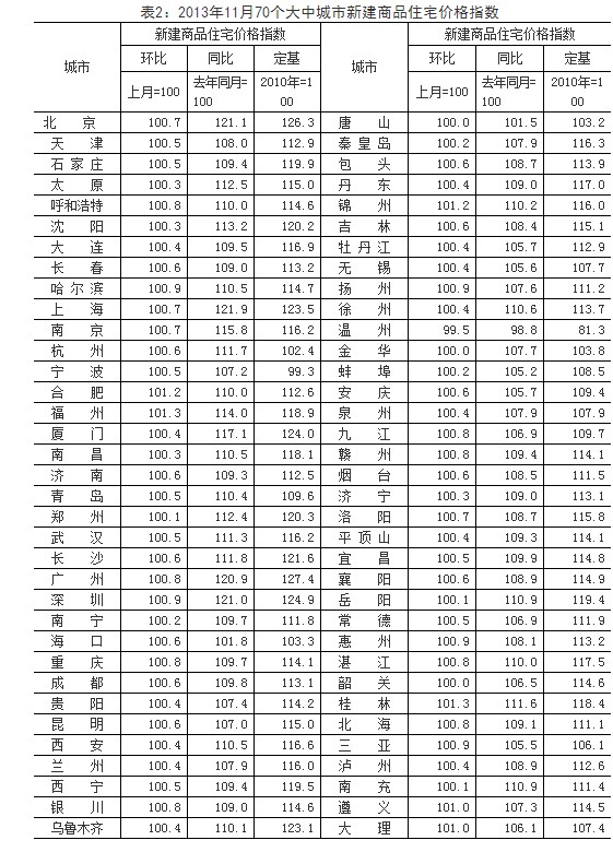 (二)与去年同月相比,70个大中城市中,价格下降的城市有1个,持平的城市有1个,上涨的城市有68个。11月份,同比价格变动中,最高涨幅为20.1%,最低为下降5.7%。