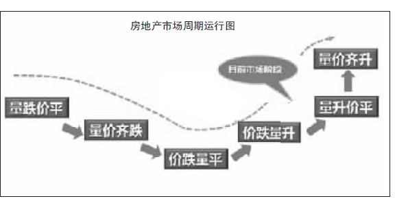 启源整合房产机构认为,从市场化的角度来考虑房地产市场,其表现也是周期性的。从市场开始下行作为周期起点的过程为:量跌价平→量价齐跌→价跌量平→价跌量升→量升价平→量价齐升,这种规律具有较为普遍的意义,以全国市场在2011年1月份国八条之后的这一周期作为参考:限购令出台后不久,成交量开始下滑,价格没有做出迅速的调整;至2011年3-4季度成交量开始跌到谷底,此时价格普遍开始松动;低成交量的态势继续维持到了2012年1季度,此时价格继续下行;2012年2季度,全国市场价格筑底,成交量开始回升;2012年3季度,价格开始回升,成交量继续上扬。