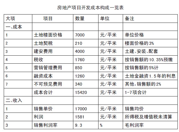 以温州市区的某个项目为例,该项目的楼面价格约为7000元/平方米,整个开发过程中所包含的开发费用及成本包括:土地契税、建安费用、配套费用、管理营销费用、预缴税费、财务成本以及不可预见成本。这些成本累积后达到15420元/平方米,而项目目前销售的价格约为17000元/平方米,销售利润率约为10%,属于薄利,与全国成熟市场基本一致。