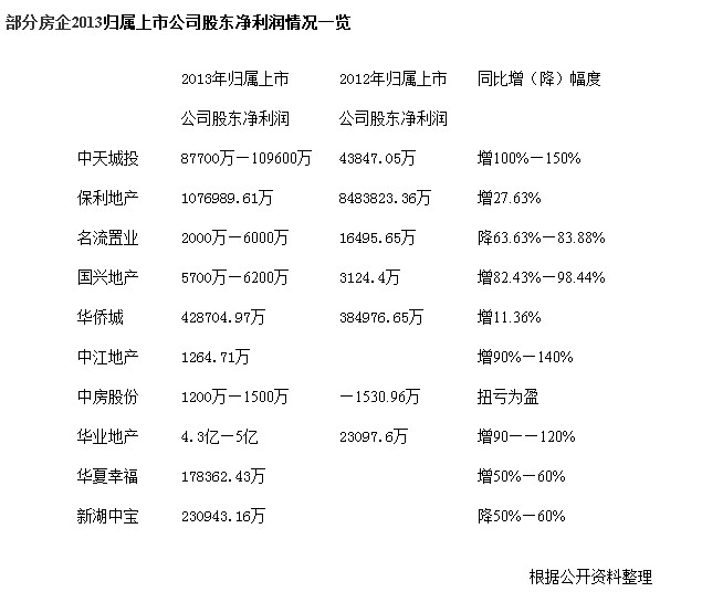 已披露业绩预告的10家房企分别是保利地产、华侨城、中房股份、华夏幸福、名流置业、国兴地产、中房股份、华业地产、新湖中宝、中江地产。而上述企业中,除名流置业、新湖中宝外,均实现了业绩预盈。