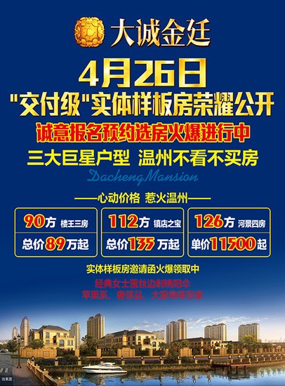 4月26日,大诚金廷“交付级”实体样板房荣耀公开,诚意报名预约选房火爆进行中。三大巨星户型,温州不看不买房。90方楼王三房总价89万起、112方镇店之宝总价135万起、126方河景四房单价11500起。实体样板房邀请函火爆领取中,经典女士蕾丝边刺绣阳伞,苹果系、奢侈品、大家电等您拿。