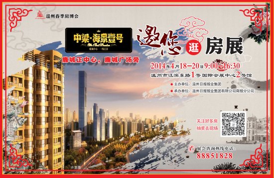 中梁·海景壹号(详细信息团购论坛)邀您逛房展,鹿城正中心,鹿城广场旁。2014年4月18日-20日上午9:00-16:30,温州江滨东路1号国际会展中心2号馆。