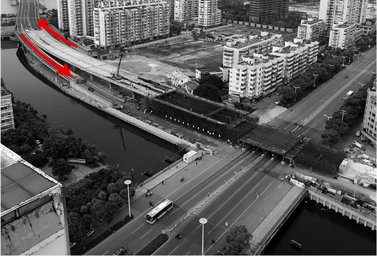 昨天,过江通道在市区的建设工地,桥面施工已进入江滨路。红色箭头表示车辆进入和离开的方向。