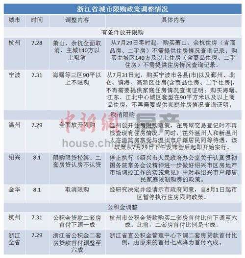 7月31日,宁波市住建委发布消息,自7月31日起宁波分区域取消、放松限购;8月1日,绍兴市住房和城乡建设局通知显示,绍兴限购限贷双双松绑,二套房贷施行“认房不认贷”,同一天,金华住建局发文称自即日起市区暂停执行住房限购政策。
