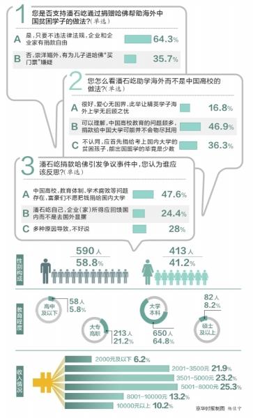 对此,本报联合清研灵智信息咨询公司发起了题为“潘石屹捐赠哈佛近亿元引争议,你怎么看”的调查。调查显示,六成多受访者支持潘石屹捐赠行为,近半数网友理解他助学未选择中国高校的做法,认为中国高校该反思。对此,有专家表示,这从侧面证明了我国公益行业及所在的社会环境并不理想,我国高校存在诸多问题,公众的希望和富豪的选择之间存在矛盾。