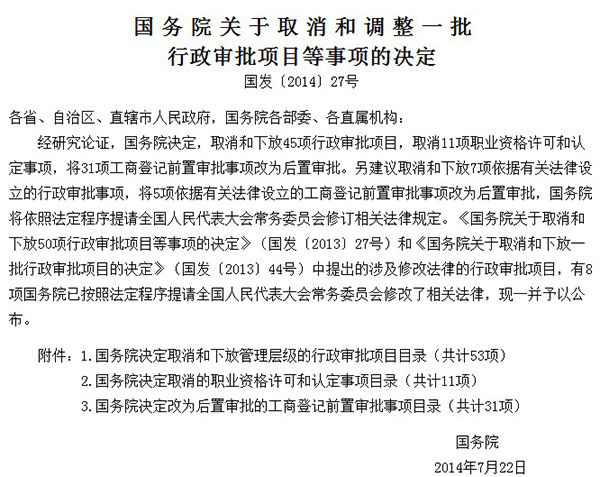 据国务院官网发布的《国务院关于取消和调整一批行政审批项目等事项的决定》显示,国务院取消和下放45项行政审批项目,取消11项职业资格许可和认定事项,将31项工商登记前置审批事项改为后置审批。