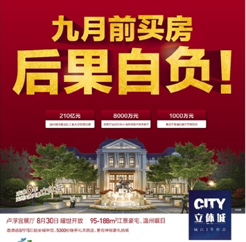 温州立体城卢浮宫展厅8月30日耀世开放,95-188㎡江景豪宅,温州瞩目。 ![]() 温州立体城由万通立体之城与新希望地产有限公司携手共建,总投资200余亿元,规划总占地面积约765亩。项目位于永嘉县三江商务区,与温州大南门商圈一桥之隔,是集住宅、商业、写字楼、公寓以及健康医疗产业、教育产业、五星级酒店、观光旅游等城市产业为一体的立体微城市,致力于打造成为温州的陆家嘴。 2014年8月30日,绝美卢浮宫展厅即将恢弘登临,一场“绽放瓯江”的盛宴就要上演。 [编辑: 蒋丽萍]