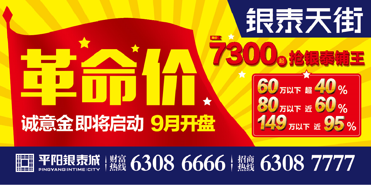 平阳银泰城烫金旺铺9月盛大开盘,劲爆低价绝无仅有!单价7300元起抢占银泰铺王,60万以下商铺超40%,80万以下商铺近60%,149万以下商铺近95%,革命血拼价史无前例!商铺诚意金报名即将强势启动!抢铺大战,一触即发!