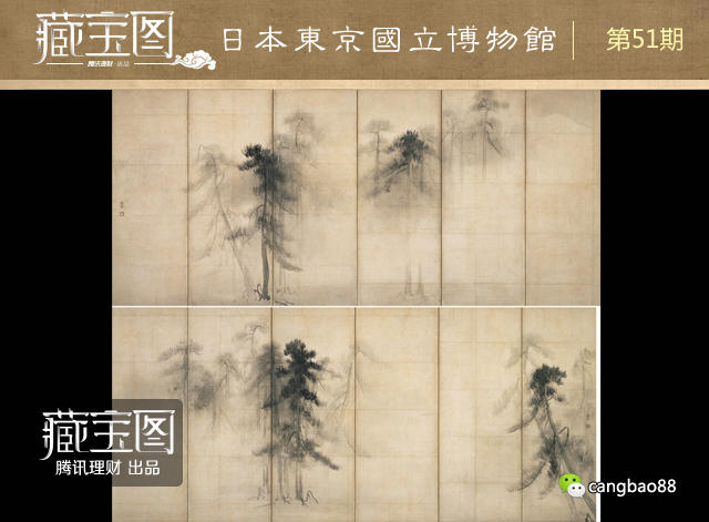 【镇馆之宝二:《松林图屏风》】是日本安土桃山时代的画师長谷川等伯的代表作,是近代日本水墨画的代表作品之一,被定为日本国宝。《松林图》水墨墨色使用巧妙,构图简洁明快,用笔生动活泼,水雾浓郁飘缈,气魄豪壮爽朗,既得中国水墨画笔墨之精要,又不失日本绘画的独自性格。