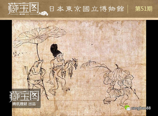 【《鸟兽人物戏画断简》】是日本平安时代(12世纪)的纸本水墨作品,将青蛙和猴子拟人化地表现,是一种幽默的表现方式,也算日本漫画的一个开端。