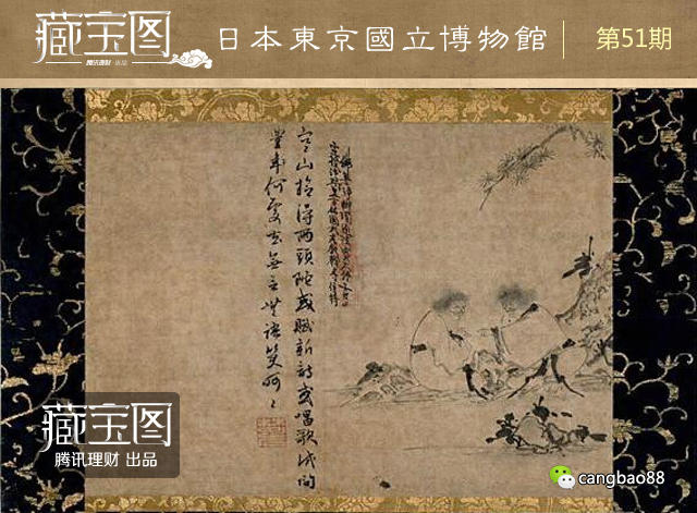 【元代画僧因陀罗《寒山拾得图》】《寒山拾得图》是因陀罗所作的一整卷禅机图中的一部分,日本人喜欢把一副长画卷裁成多个部分,然后裱制成画轴挂在墙上欣赏。所以因陀罗的这卷禅机图被分成多个部分,由不同的美术馆收藏。