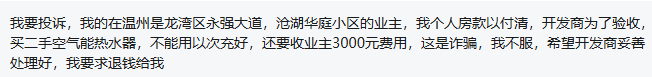 投诉人称,2025年11月份,自己拿到沧湖华庭小区房子的钥匙,准备装修时,才发现这个为了验收加装的空气能显示的生产日期不对。室外机主机产品显示生产日期为2021年,储水器(业主所称的桶机)大部分是2023年。空气能产品老旧不说,两个组件的时间差距还这么大,业主们怀疑是旧机、翻新机,认为存在消费欺诈,担心产品质量无法保证。业主1:你们这样的东西给我们,还2982,我们不接受的。