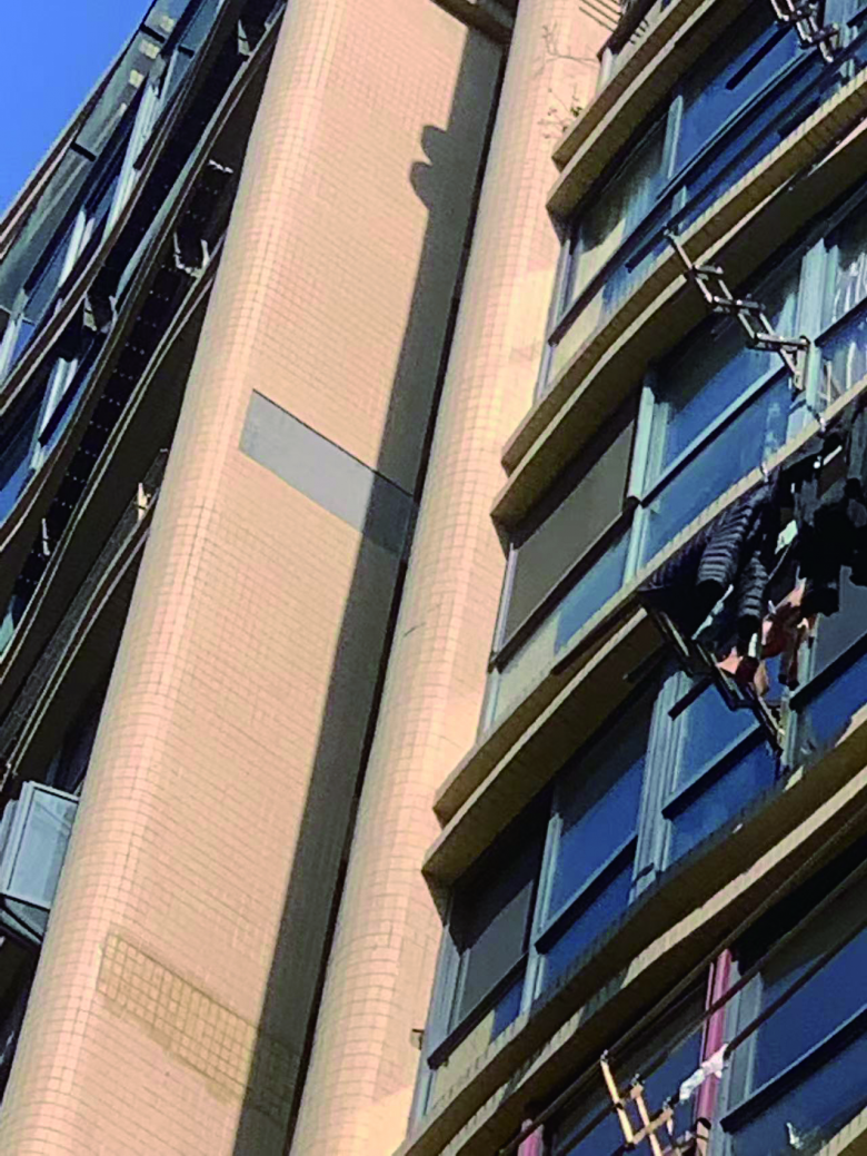 小区一栋楼的外墙瓷砖脱落和“打补丁”的痕迹