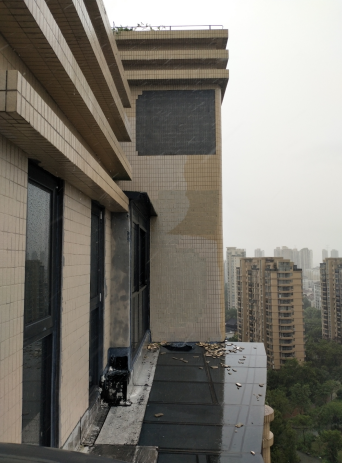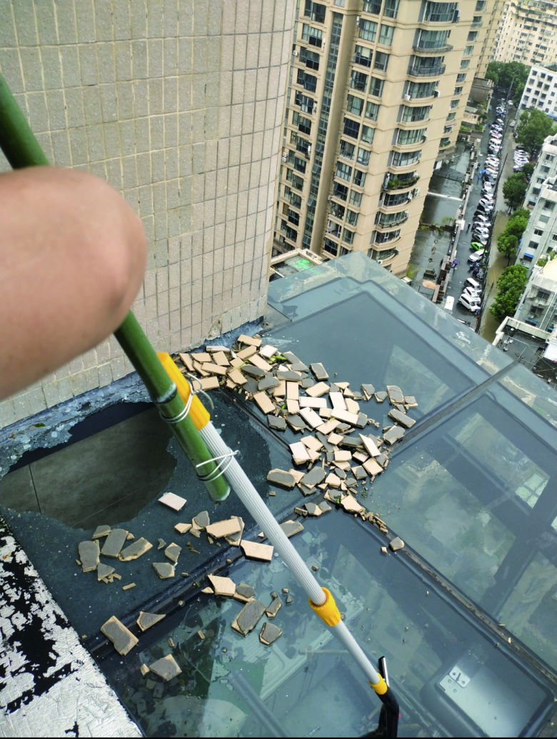 外墙脱落的瓷砖击穿一处阳光房顶棚