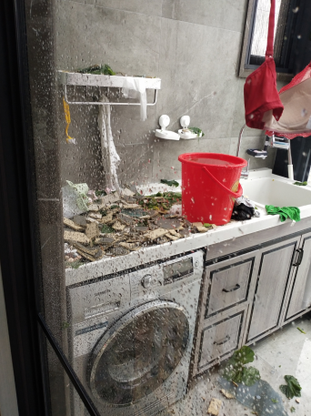 去年10月23日上午9时许,一名快递员骑着电瓶车在小区内经过,几片瓷砖从天而降,砸到了离他大约3米的路面上;此外,还有一块脱落的瓷砖击穿了低楼层业主的阳光房顶棚,砸中一台洗衣机,现场一片狼藉。
